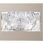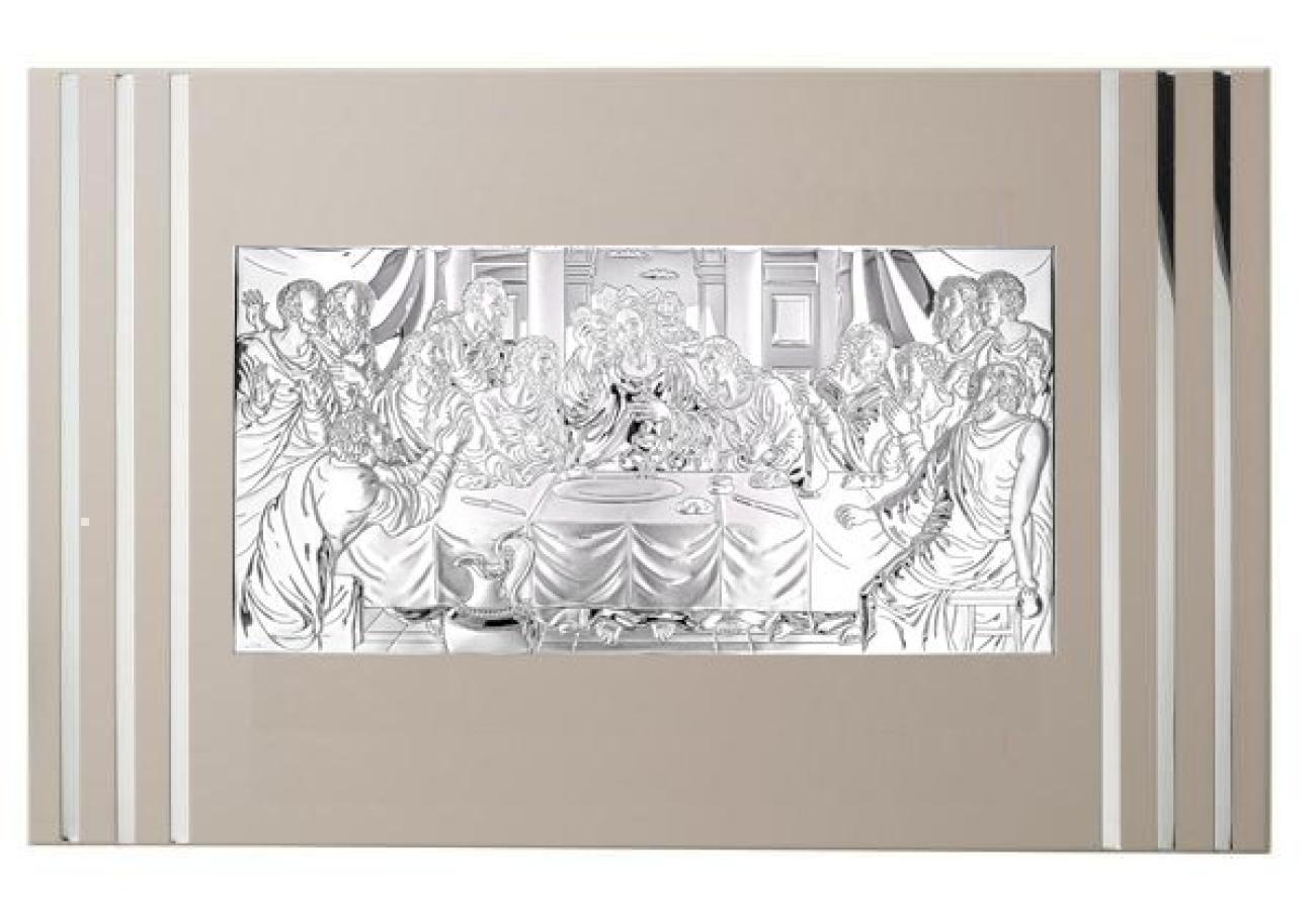 Ікона «Тайна Вечеря» зображує Ісуса Христа з апостолами та скорботне з ними застілля у вечір перед самим розп’яттям. Сюжет картини розкриває момент затвердження Христом Таїнства Святого Причастя. Сюжет цієї ікони написаний відомим іспанським художником Хуаном де Хуанесом приблизно у 1562 році. Рамка – шпон дерева бежево-сірого відтінку (змінюється в залежності від освітлення). З обох країв рамка має по три смужки з дзеркальним блиском, які надають іконі більш сучасного вигляду. Відтиск на виробі“Made of Miro-Silver“ гарантує, що кожен продукт є частиною колекції ручної роботи, виготовленої в Італії з високоякісних матеріалів та дорогоцінних металів. Образ створено за новітньою технологією обробки поверхні до якої входить шар чистого срібла 999,95%, що надає міцності покриттю та більшу стійкість до окислення. На звороті ікона має підставку та отвір щоб її повісити на стіну. Ікона Тайна Вечеря буде оригінальним та пам’ятним подарунком на новосілля, весілля, ювілей та інші події. Розмір разом з рамкою – 68х42 1см. Розмір самої ікони – 39х19 см.