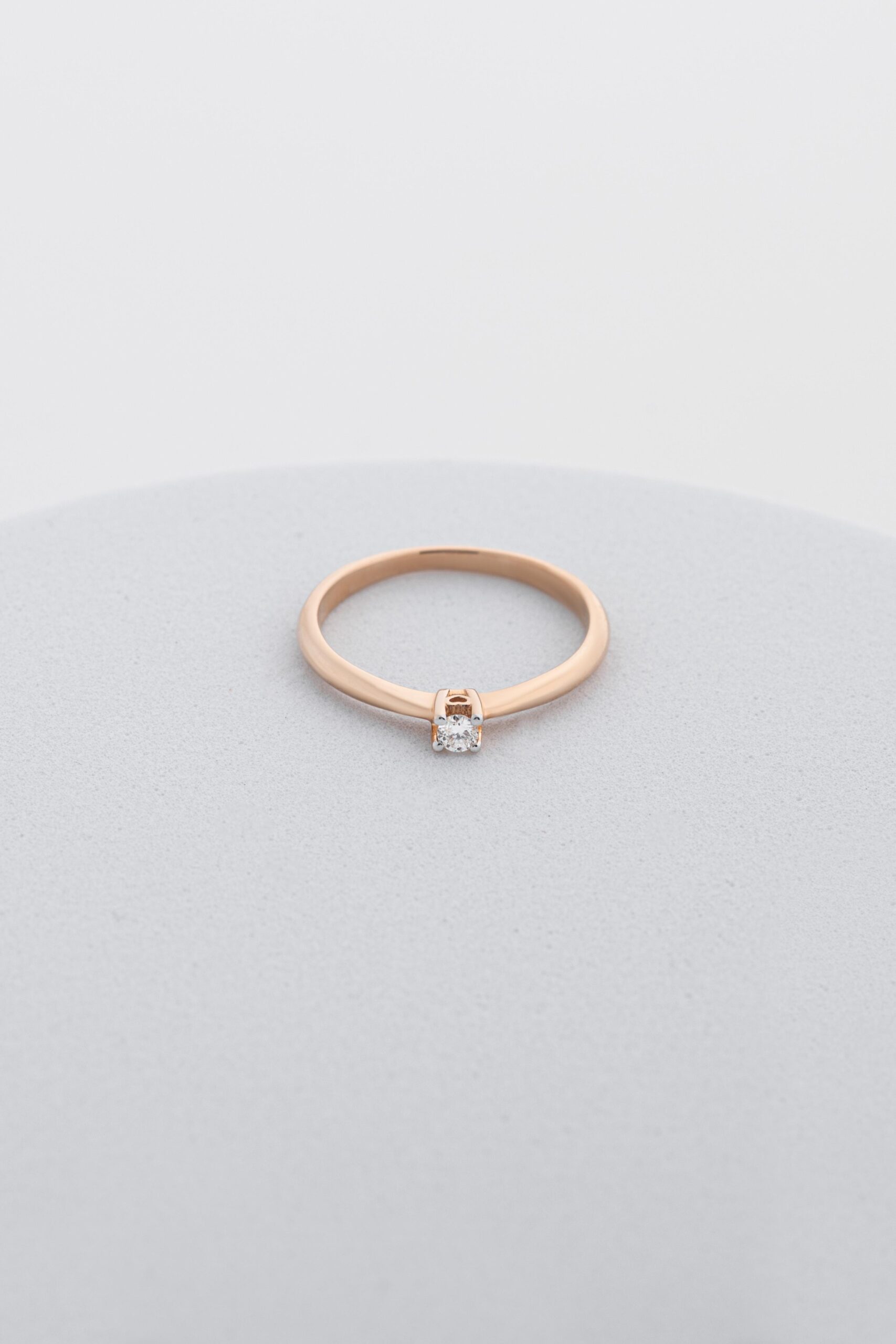Вишукана каблучка, виготовлена з червоного золота 585 проби, втілює в собі класичну елегантність і сучасну витонченість. У центрі композиції — натуральний діамант, майстерно закріплений у чотирьохкрапановому кріпленні, що дозволяє каменю максимально розкривати свій блиск та гру світла.