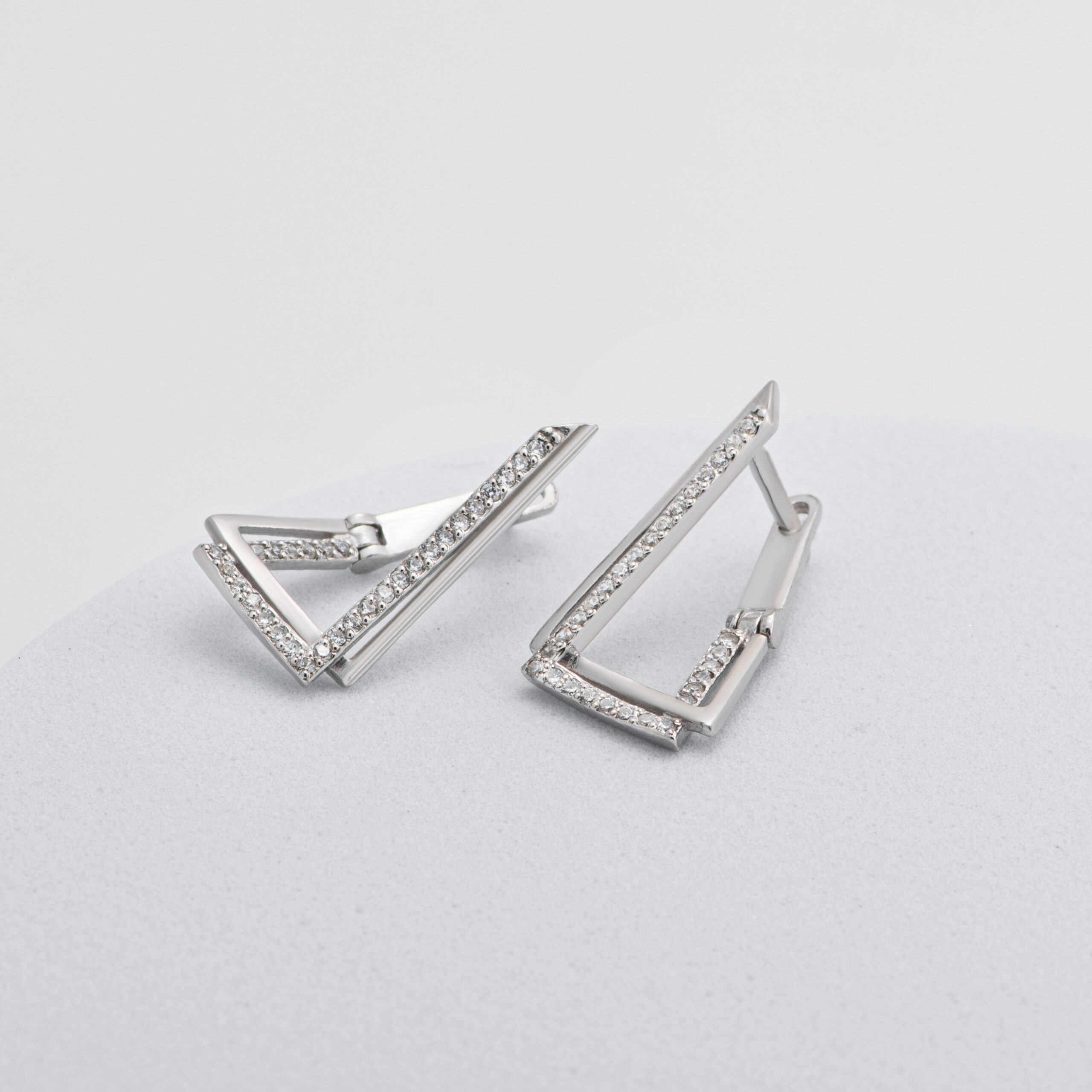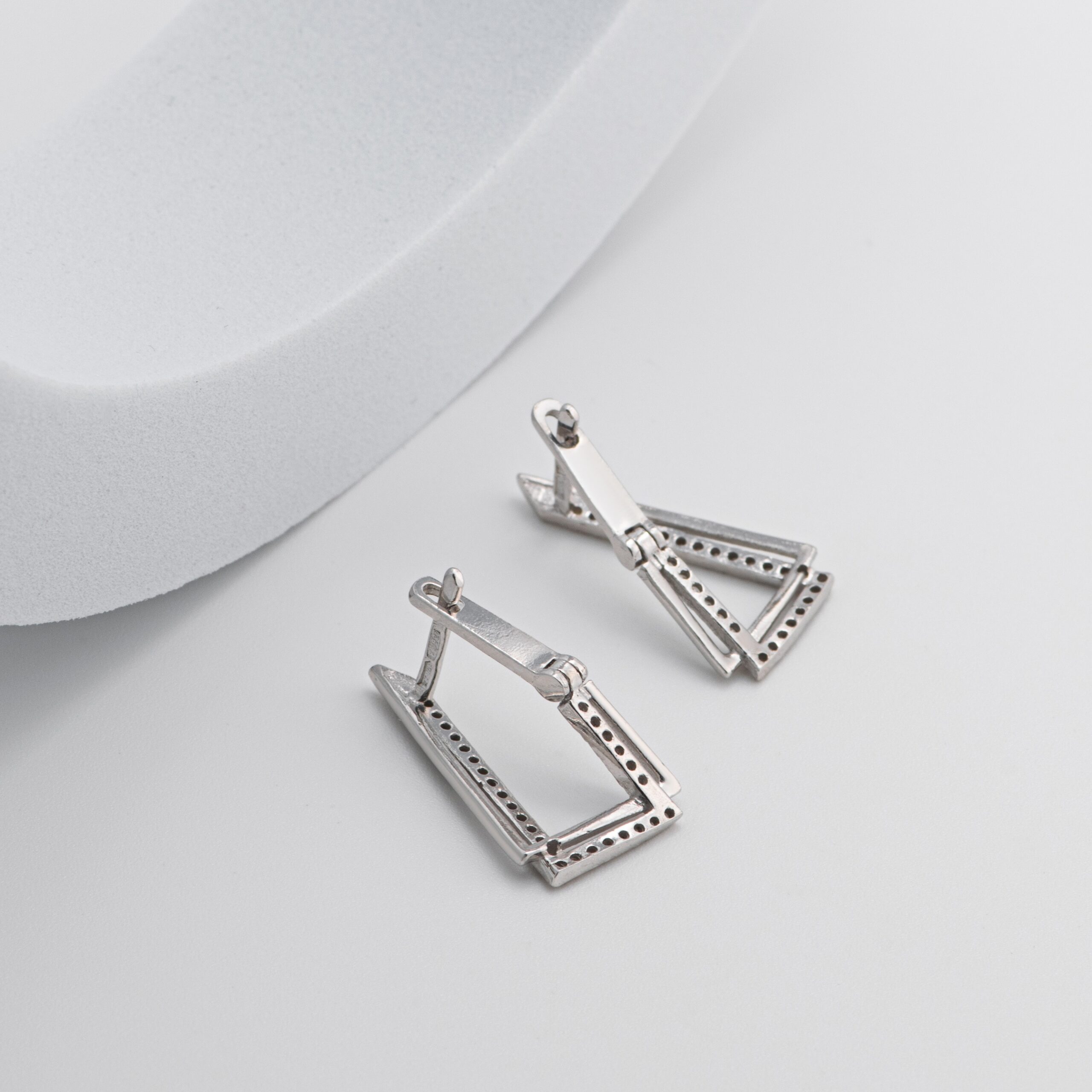 Срібні сережки у формі трикутника — стильний акцент з яскравим блиском. Їхній сучасний дизайн та грайливий блиск роблять цю модель ідеальною для тих, хто цінує незвичайні аксесуари. Англійська застібка забезпечує надійне кріплення та комфортне носіння протягом дня. Високоякісне покриття захищає виріб від потемніння та подряпин, зберігаючи його ідеальний вигляд надовго.